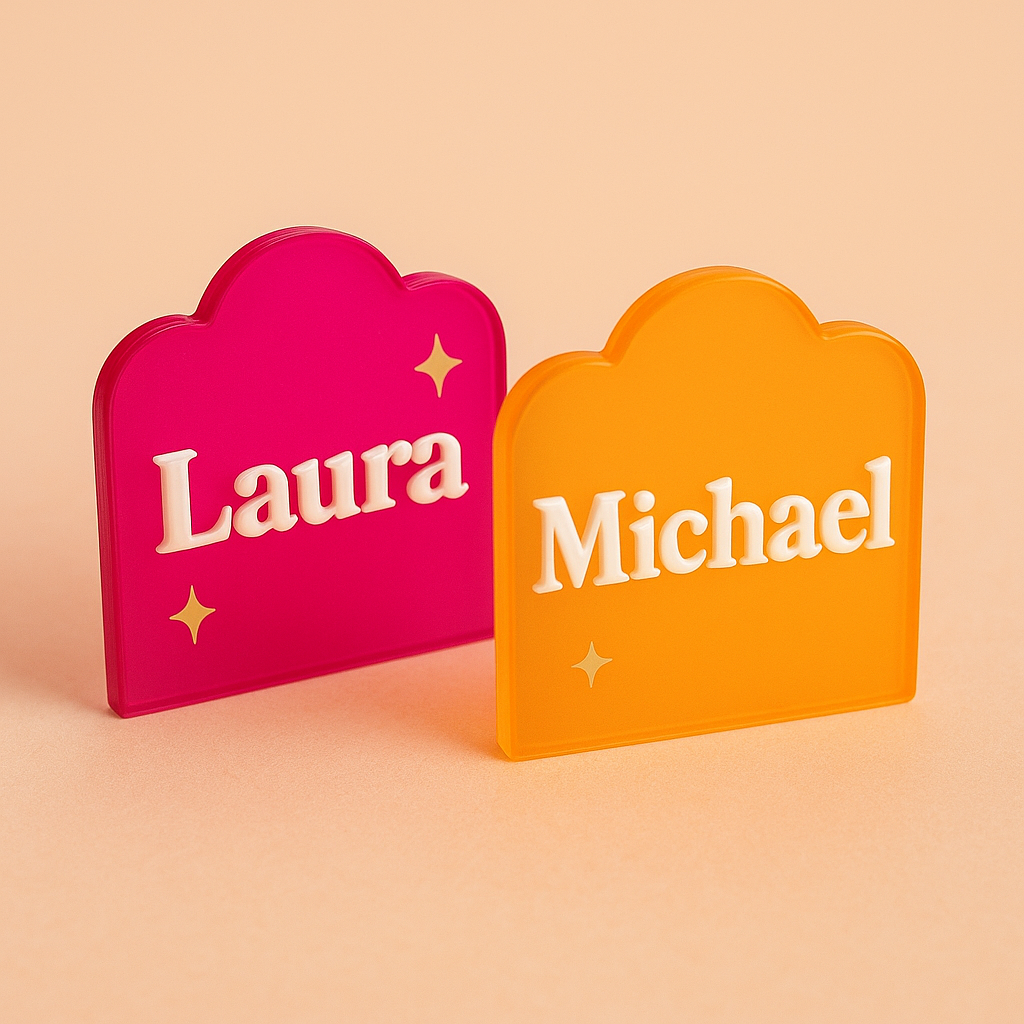 Playful and expressive drink tags featuring names, initials, or a logo, designed to add colour, personality, and charm to your drinks.